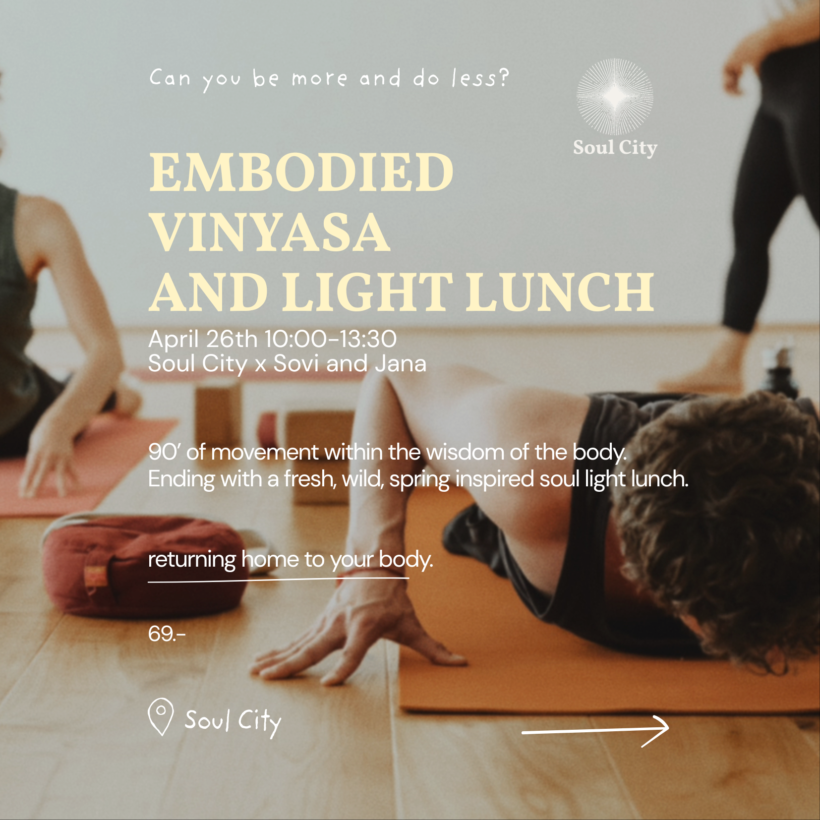 Sovi will guide you through a 90-minute embodied vinyasa practice & Jana will offer a spring-inspired soul lunch - light, fresh, vibrant, and seasonal.